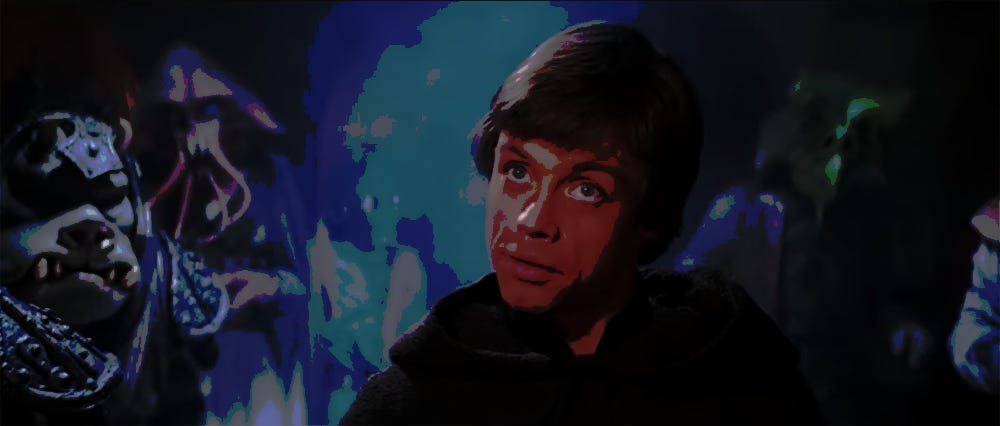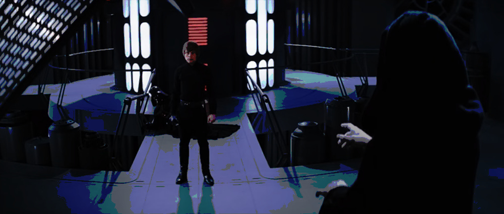 Here, we see Luke already succumbing to the Dark Side of the Force. He’s using Dark Side powers, his body is already starting to be replaced with robotic parts, he’s even wearing black—all like his father of course, reminding us of the path his father once took.