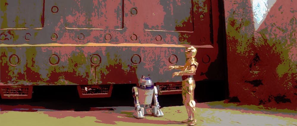 Does Luke show up to collect Han… but then has to come back the next day and ask if he can buy back the droids as well? Or just R2-D2 at least, because he’s carrying the brand-new lightsaber Luke just constructed for himself, symbol of his Jedi Order?